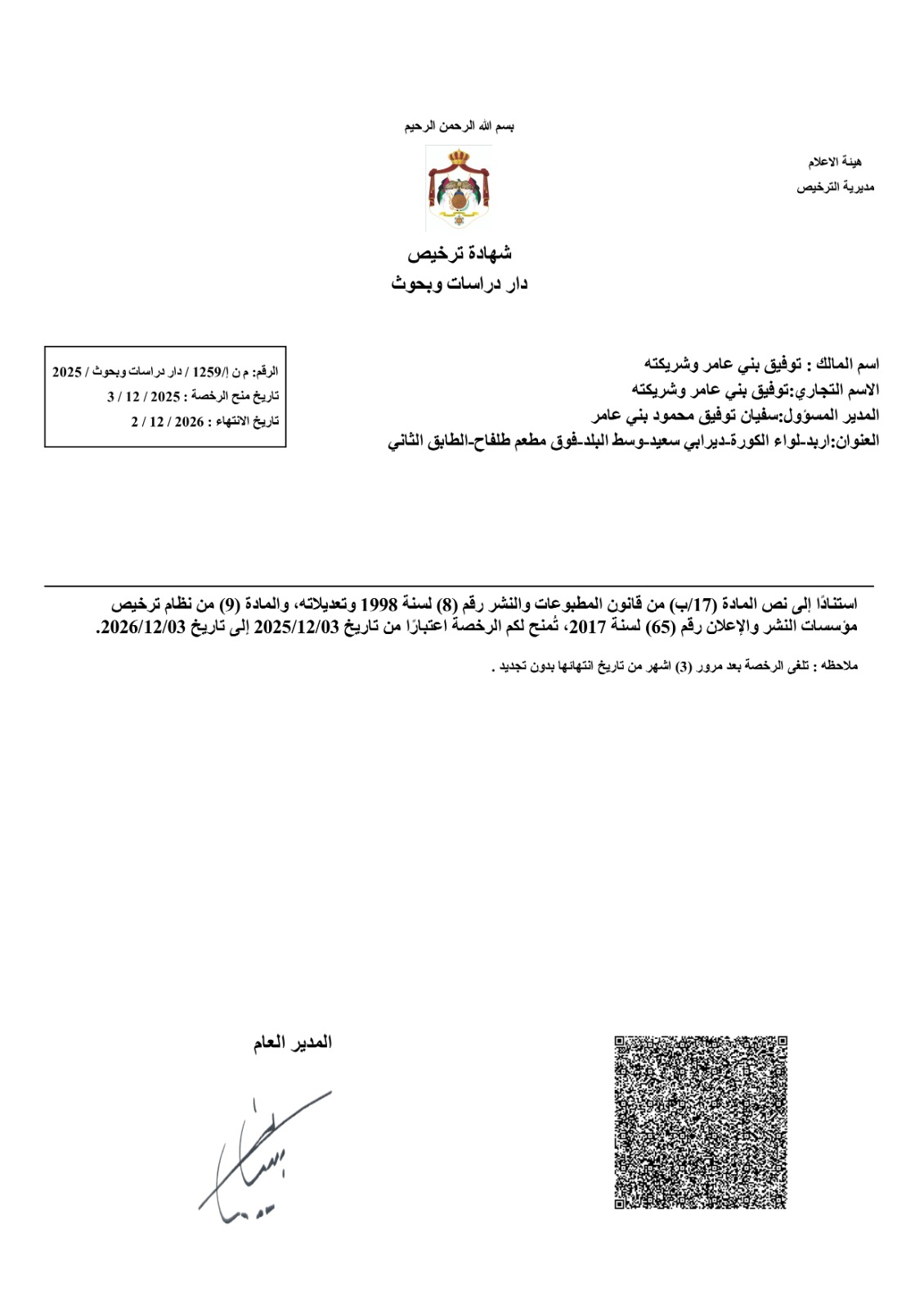 Noor Al-Elm Publishing and Distribution House is a specialized center for knowledge production and scientific research, officially licensed by the Ministry of Information in the Hashemite Kingdom of Jordan. The House obtained its initial publishing license in 2023, and in 2025 it received an additional license as a “Research and Studies Center”, expanding its scope of academic and research activities.